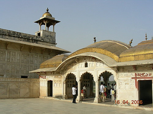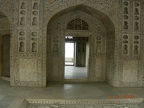 ~休息一會後前往阿格拉紅堡,為16世紀蒙兀兒帝國所建。此堡具有宮殿和城堡雙重功能,城堡周圍護城河長2.5公里牆高20餘米,壯觀的城牆顯得神聖不容侵犯。此堡是以鄰近所產的紅沙岩為主建材,因此又稱紅堡。沙加罕晚年被他的第三子囚禁於紅堡內的八角型樓塔,每日凝望者愛妻的陵寢直到撒手人寰。隨後去參觀大理石工廠,導遊告知這些工人都是世襲的,由於印度教的關係,這些人祖宗18代都做著一樣的工作一輩子都沒辦法出頭天(除非離開印度)。之後看著整團購物貢獻最大的領隊大開殺戒購買了很多東西,讓我們日後都不會被導遊為難。晚上回飯店吃晚餐,又是咖哩雞咖哩羊