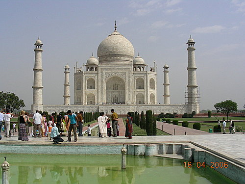 ,其餘都還不錯。吃完早餐後隨即驅車參觀印度門,這是模仿凱旋門為了紀念第一次世界大戰死亡的軍人建的,之後開車往總統府沿途參觀新德里的高級住宅與政府區,午餐是在一家中菜館吃飯,只能說印度式的中國菜很難吃,但也只能將就了,下午開車往阿格拉,這趟往阿格拉的路上發現原來印度人開車要超車是按喇叭把前面車趕走的,在經過4個小時後終於在傍晚抵達,立刻前往飯店,休息一會後吃了在印度的第一餐印度菜(自助餐),有咖哩雞咖哩羊煎魚等主菜,其餘都是印度炒麵、咖哩豆、印度起士、咖哩花椰菜高麗菜、還有甜死人的甜點(只有冰淇淋好吃)等東西(我們日後的幾餐印度菜都是這些菜),晚餐後回房休息等待第三天的行程。